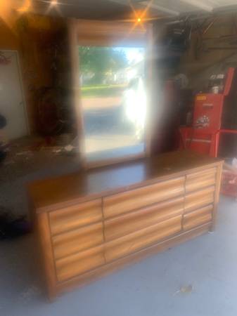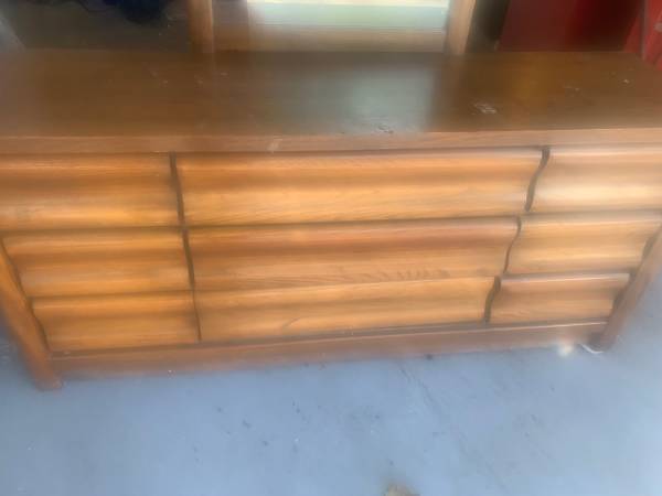 Heavy wooden dresser could use a good cleaning or possible refinish, moving and not taking with me