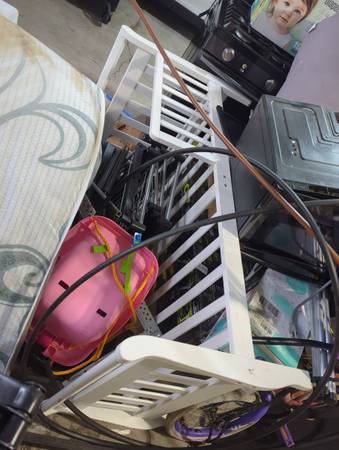 Working washing machine, working stove, dishwasher, microwave (not sure if it works), kids bed frame, shelf, rv cover, and a lot of junk. Just looking to get rid of.
