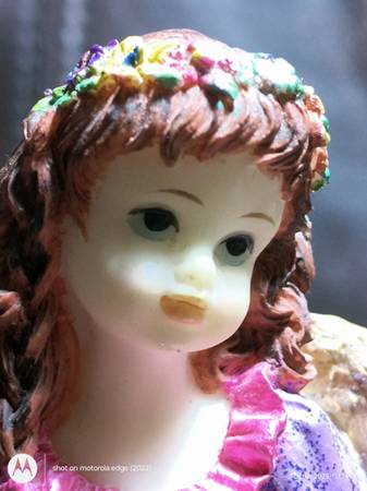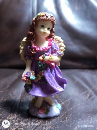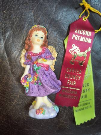 Brown haired angel in a purple dress. Hand painted. 4 3/4 " tall This statue won a second place ribbon at the Carver County Fair. (I am keeping the ribbon.)