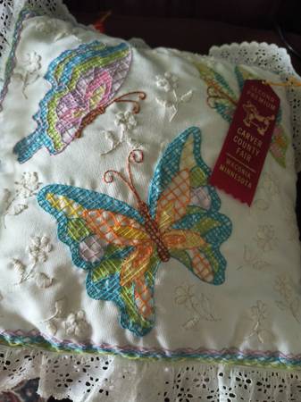 Hand sewn butterfly pillow. 12 1/2 " square. This pillow took second place at the Carver County Fair. (I will keep the ribbon.)