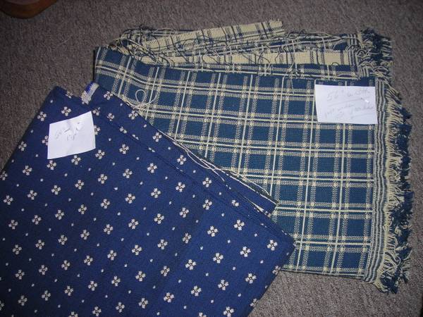 Choice of 2 upholstery fabric pieces. One piece is approx 2 yards; second piece is approx 1 yard. Markings on pix show measures of the pieces. The 1 yard piece is a darker blue than the pix shows. $5 for the 1 yard piece; $10 for the 2 yard piece. CASH ONLY. INCLUDE PHONE NUMBER for further communication.