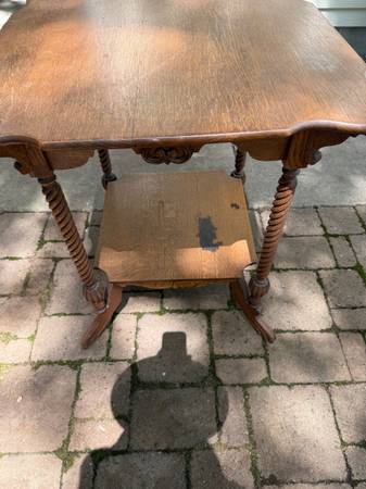 For sale is an antique solid quarter sawn oak occasional table. It does have some staining on it as shown in the pictures. This is a very heavy piece of furniture. It is 29” high, and the top is 26” wide. Serious inquiries only by call. I do not respond to texts. $50