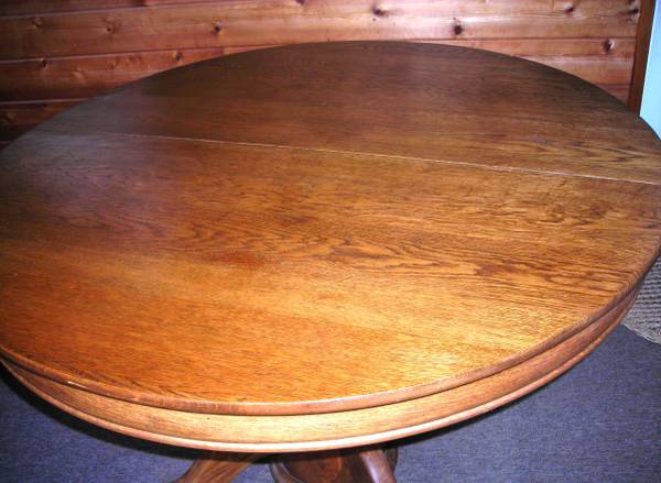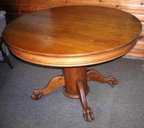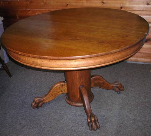 Claw foot OAK TABLE. In our family for three generations -- possibly from early 1900's / late 1800's? Refinished and in super condition as shown in pictures. Diameter: 45 inches. Height from floor: 30". $400. CASH ONLY. INCLUDE PHONE NUMBER for further communication.