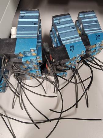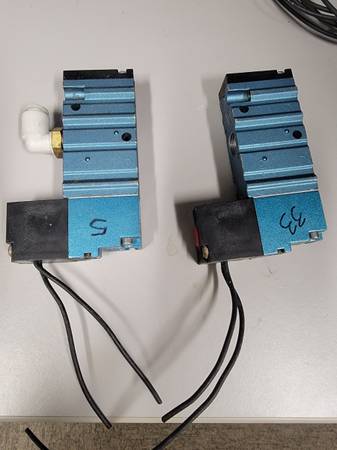 Manufacturer: MAC Valves Inc. Model: 52A-11-D0A-DM-DDDD-0BA=RPTE Type: 4-way, single solenoid, direct solenoid valve Application: Pneumatic automation systems Condition: Used, untested—wires intact,...