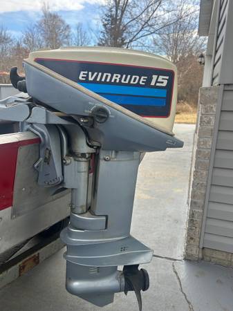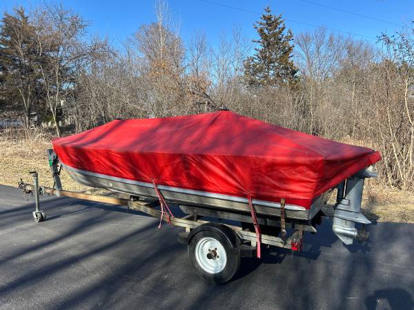1982 Lund Model S-14-15” DMX with new flat floor and carpet 35Hp max. New red paint outside. Trailer lights all work with Spare takes 1 7/8” ball. Comes with Evinrude 15Hp model # E15RCNC runs will demonstrate. Comes with boat cover. Also comes with nice set of aluminum Oars.Lowered price to $1550.00. Will separate boat and trailer $1100.00