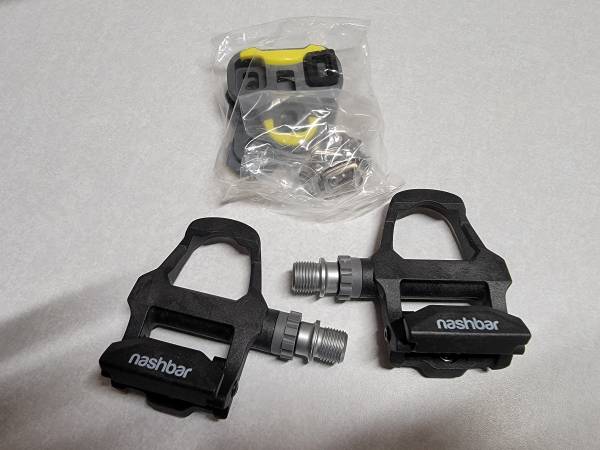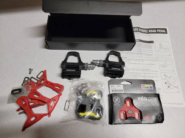 Nashbar Alpe D'Huez Road Clipless lightweight Pedals w/ Cleats: Look Delta Compatible - Black (NEW). Very similar to Look Delta pedals. New MSRP $69.99. Includes Three pair of extra KEO/LOOK cleats. Two new and one set used. Provided cleats allow for standard two- and three-hole shoe cleat mounts.