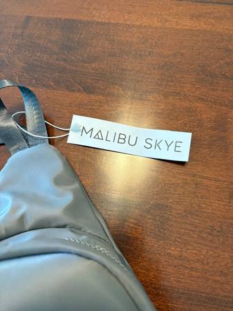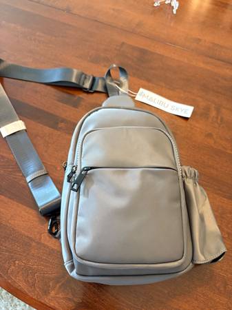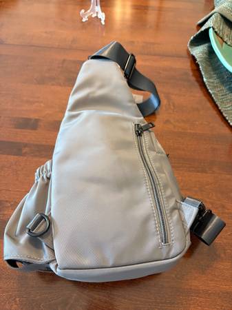 Sturdy nylon material. 2 zipper pockets in front. 1 large zipper pocket in back. 2 pockets inside, 1 zippered. Small water bottle holder on side. 10"T x 6.5"W. Non-smoking home. Cash only.