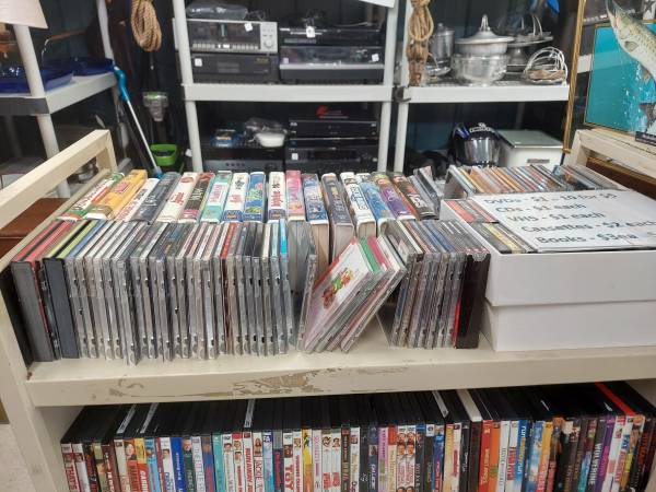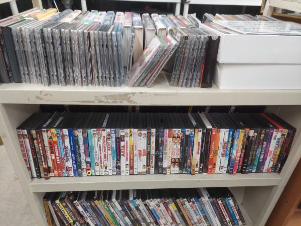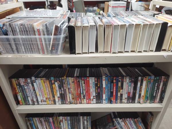 CDs, VHSs, DVDs, Cassette Tapes, Sanyo Cassette Player, Records, 2 Computer Towers, Misc Computer Parts, 4 Monitors, Rolling Printer Cart, Blu-ray Player, Sony Headphones, Smart Watch, Phone Chargers, Camera Stands, Record Player, Etc.
