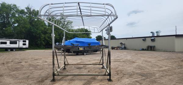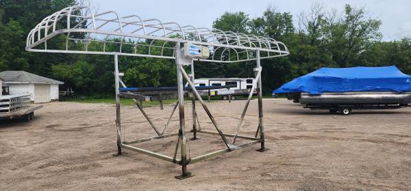 Shore Master 3000 lb vertical lift,108" Beam,for runabout, 110V Sidewinder winch, 23' canopy but canopy frame is bent, Full length carpeted bunks, motor stop, AC motor, Motor/winch sounds good going up but not going down, pulleys lubed, canopy leveled, motor and winch function, canopy has some staining and patches.