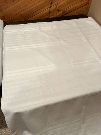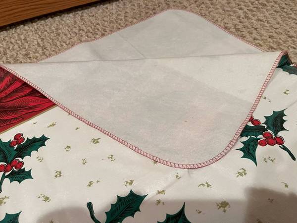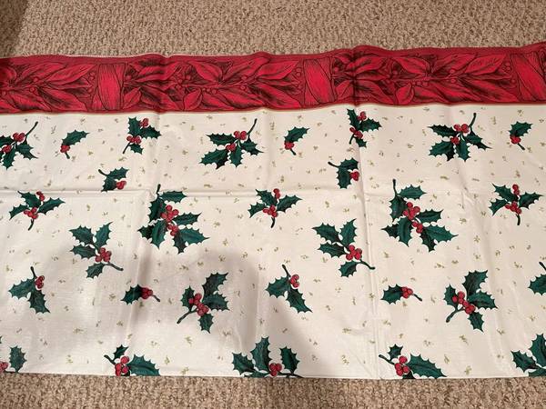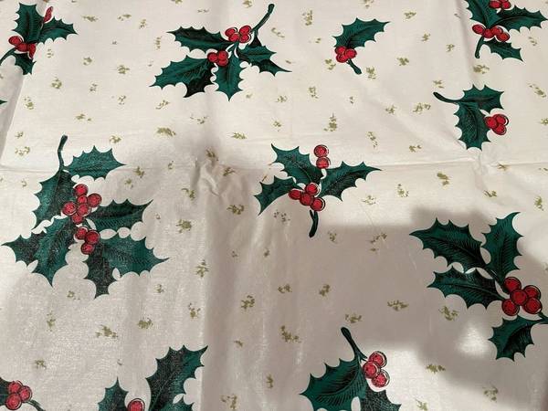 For sale: a Holiday Winter Holly Vinyl tablecloth with a flannel back. Approximately 52” x 70” White linen tablecloth with a subtle design. Approximately 68” x 50” $3 cash for both Please text or...