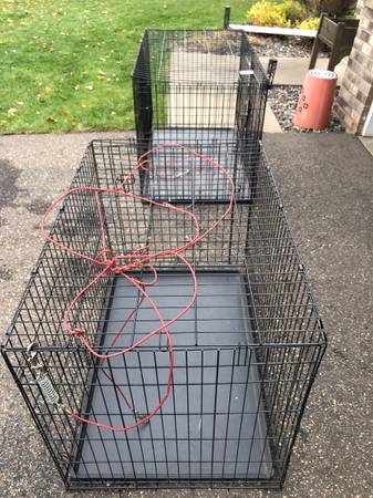 They both come w/ a plastic bottom tray and cable leash extenders w/ metal clips….can attach to the crates or use for tie-in stakes for the yard.