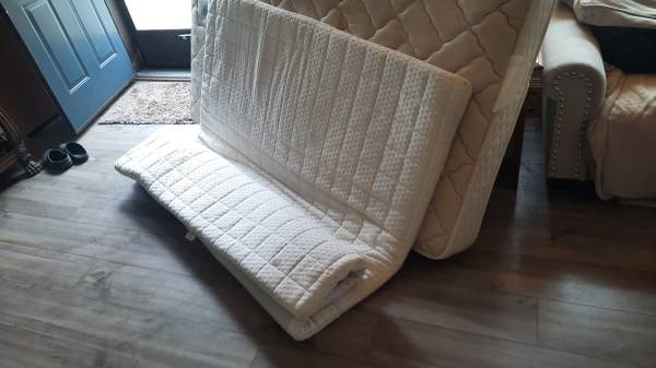 Full boxspring, rolling frame and 2 inch mattress topper. Some light wear but very useable condition. Free.