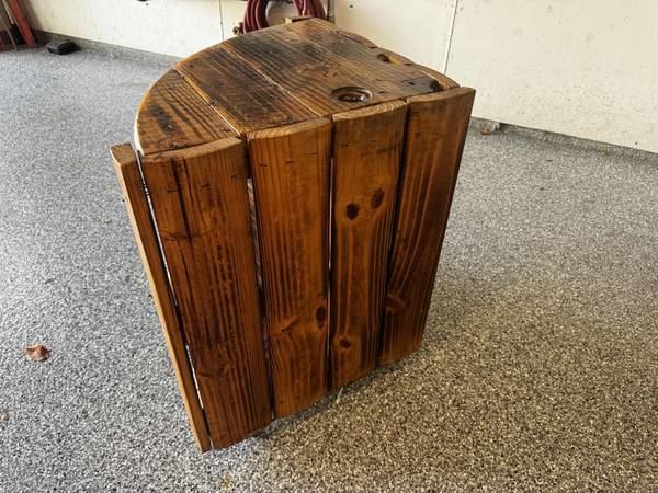 Purchased at Junk Bonanza a few years ago, this handmade corner shelf unit is built from reclaimed wood and looks great. Three curved tiers fit snugly into any corner, great for small space storage or display. Dark-stained finish with natural wood grain and mixed-tone back panel. Middle shelf includes a circular cutout for cable pass-through or decor.