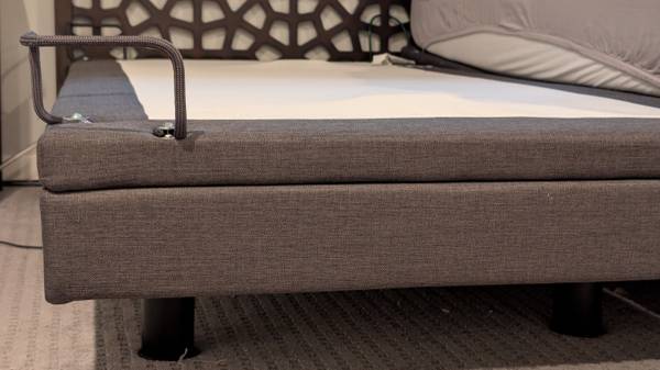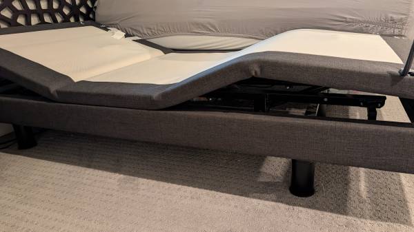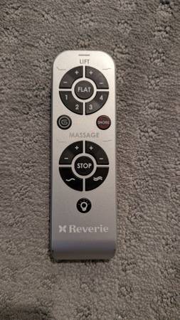 For sale is an adjustable bed frame. Only a few years old and in perfect working shape. Love this thing, only selling because my new bed came with a base. Head and feet move independently, has zero gravity and anti snore positions, comes with remote + remote dock. Reverie brand. Adjustable height legs.
