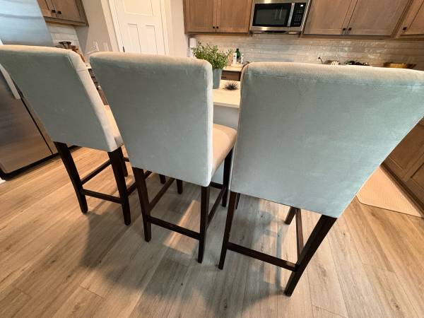 3 stools! Skyline Furniture 30" Velvet Parsons Barstool Wood , bar height For sale are all 3, beige / white velvet seat and wood frame. New these are $200-300/each. Condition is great , can perhaps...