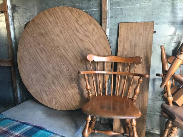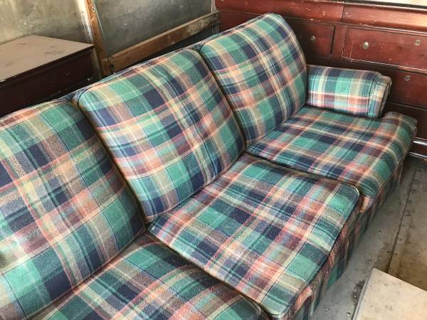 3 cushion couch, blue plaid $50., Light Blue Swivel Rocker $20., Maple Formica Top Dinette Table, one extra leaf, 4 Chairs $100., Buffet $25., Bedside Table $15. Mayer, MN.