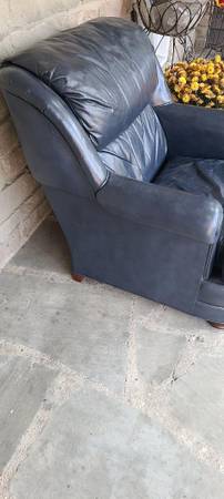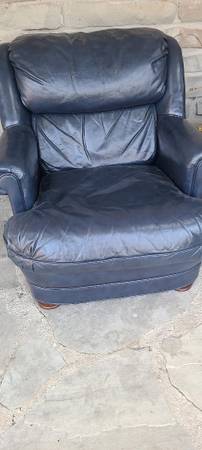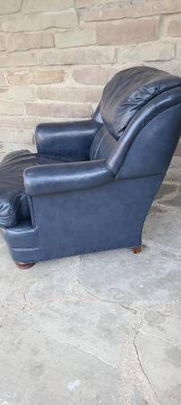 Blue leather chair - Wood knob feet and very comfortable to sink into. Small mark on back side seam. No cracks, wear, or other issues. $50 firm. Will respond faster to texts.