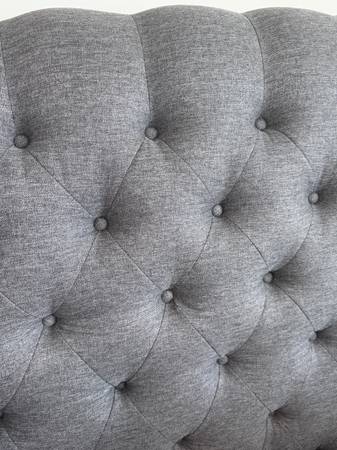Selling our king size bed frame and headboard. Bought from Becker furniture world. Basically brand new. Only used for 1 year. There are no tears in the fabric. Has built in USB ports on each side of the bed. The headboard is a beautiful tufted design. Pet free home. Asking $1,000. Text show contact info
