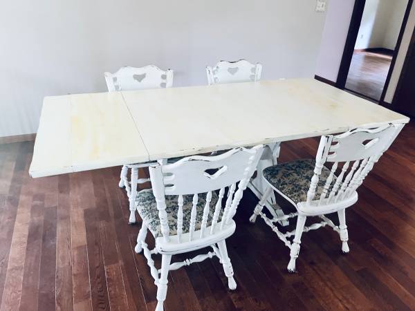 Upgrade your dining space with this beautifully crafted solid wood dining set: table, 2 inserts, and 4 chairs. This is a sturdy, high-quality set in a stylish whitewashed finish. Perfect for both rustic and modern farmhouse interiors. Email if interested.