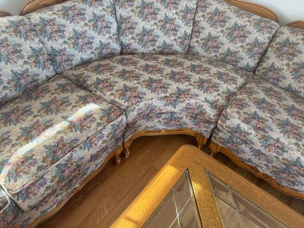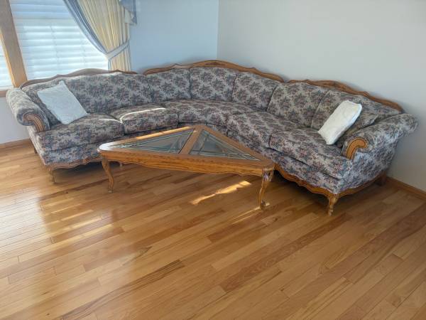 Corner sectional couch, measures 9' x 9'. Very nice pieces of furniture. Great condition. Comes with 3 piece couch, matching coffee table and chair. Very nice condition.