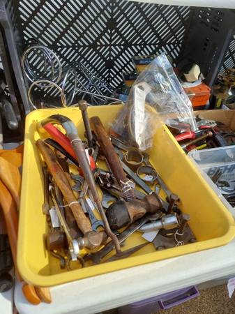 Hand Tools, Hedge Trimmer, Copper Pipe Parts, Heavy Duty Bench Brackets, Hose Winder, Vintage Plows, Tractor Wheel Chains, Shop Floor Model Heater, Kerr Parts Cleaner, Snowblower, Craftsman Tool Chest with Vice, Ice Chisel, Pressure Washer, Wire Lots of Wire, Copper Wire, Electrical Wire, Large Drill Bits, Tractor Wheel Chains, Pulleys, Clamps, Screwdrivers, Wrenches, Hammers, Lot of Hand Tools, Very Large Screws, Nuts and Bolts, Pegboard Hooks, Copper Fittings and Pipes, Come-a-longs, Craftsman Toolbox, Bissell Garage Pros Vacuum (Brand New), Heavy Duty Chain, Saws, Sprinklers, Scrollbar, Skilsaw, Toolboxes, Snap-on, Craftsman, Grinder, Drill Press, Delta Planner, Impact Wrench, Buckets, Crates, Totes, Large Barrels, Nuts and Bolts Cabinet, Grinder, Bumper Jack, Tool Tote, Auger, Parts Cleaners, Etc.