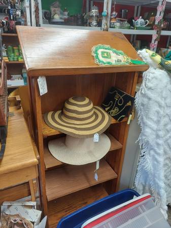5 Piece Patio Set, Rubbermaid Desk, CUTE Turqouise Sewing Collapsible Cabinet, Mission Oak Bookcases, Wicker Sofa Table and Plant Stands, Wardrobe, Antique Oak Podium, Antique Oak Dresser with Marble, Shelves, Tiger Maple Dresser with Hat Box, Spoon Carved Dresser, Trunk, Antique Oak Fireplace Mantle, Etc.