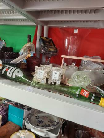 100s of Antiques and Collectibles, Red Ruby Glass, Large Sandicast Dog, Windsorware Johnson Bros Berry Bowls, Vintage Movie Projector, Cash Register, Antique School Desk, Oil Lamps, Vintage Chairs, Silver Plated Coffee Serving Pices, Powder Boxes, Avon, Cape Cod, Pony Cart, Antique Scales, Cast Iron Water Pump, Pez, Typewriter, Singer Sewing Machine, Oak Table Top, Leaded Glass Light Fixtures, Stoplight, View Master Slides, Vintage Linens, Mesh Purses, Sequin Purses, Misc Vintage Purses, Salts, Vintage Advertising Grass Seeder, Red Hat, Small Wood Boxes, Quilts, Rosette Set, Games, Wood Chocolate Butter Mold, Precious Moments, Compacts, Hair Combs, Perfume Bottle, Antique Signs, Coin Purse, Oak Mirror, Blue Willow, Native American Dolls, Hand Hammered Aluminum, Dome Antique Trunk, Olaf and Star Wars Wicket, Fisher Price, Cast Iron Pans Griswold and Wagner, Etc