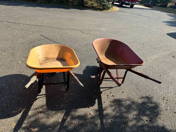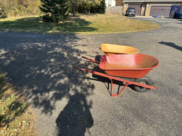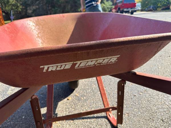 2. Red True Temper Wheelbarrow steel tray, and wood handles.