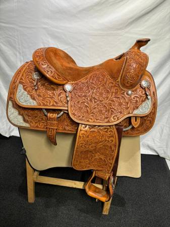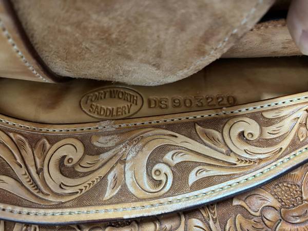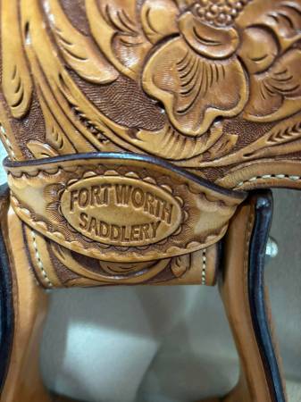16” Fort Worth Saddlery (brand) western show saddle. Full QH bars, pristine condition. Includes a 34" tooled / neoprene girth, and a red padded saddle case. 28.5" skirt length, nice padded suede...