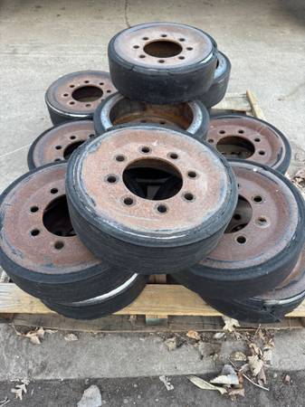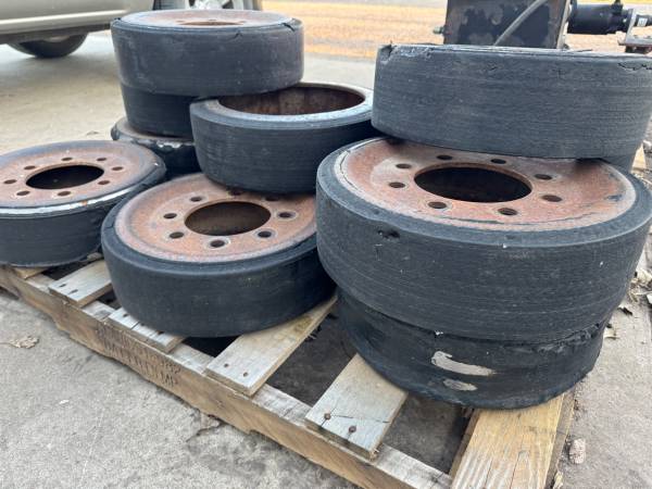 Set of 12 narrow mid rollers for a JD 8RT tractor. Some are missing pieces of the rubber as shown. There are companies that can recondition or exchange them. $600 for all 12.