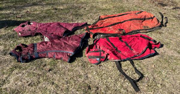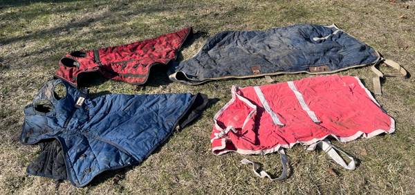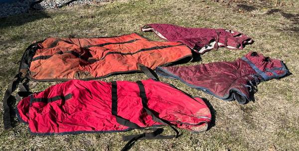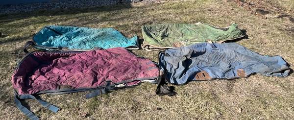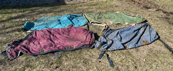 9 winter insulated blankets and hoods various sizes $20 each or $15 if you take more than 1. Also have 3 summer sheets 1 yearling, one 2 year old and the third one is a horse size. $15 each or $10 if you take more than 1. All are in good shape, some just need to be hed and will look like new. The size labels are wore off so you will need to look and decide if they will work.