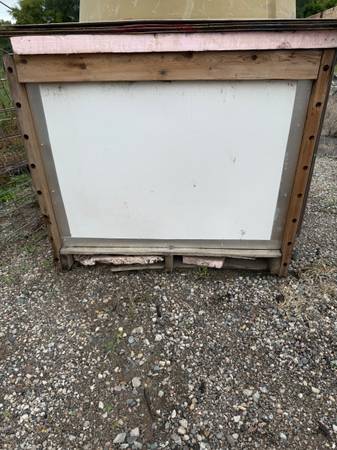 They say it is what is on the inside that counts. This dog house is insulated, wired for a light bulb to provide heat. It was inside a yard shed, so 2 sides do not have tin, but that can be added. We no longer have our dog, so this can go to a new home. We can use the forks to place it on a trailer. Presently sitting outside ready to be adopted by you, free, FCFS.