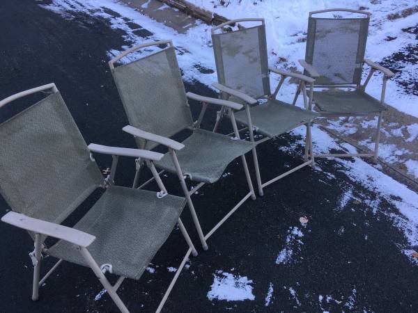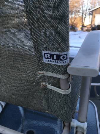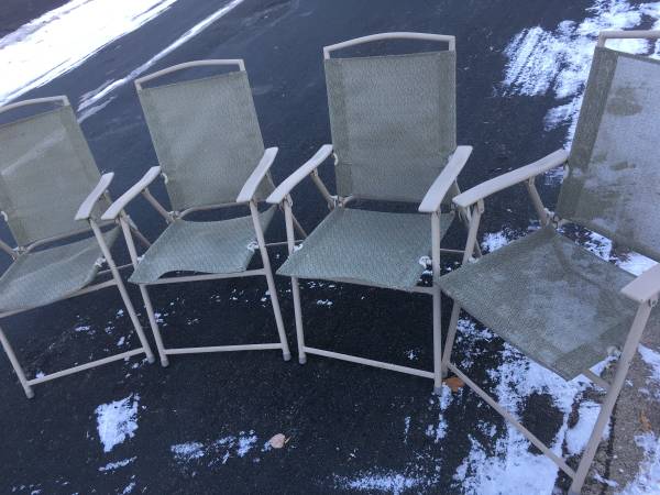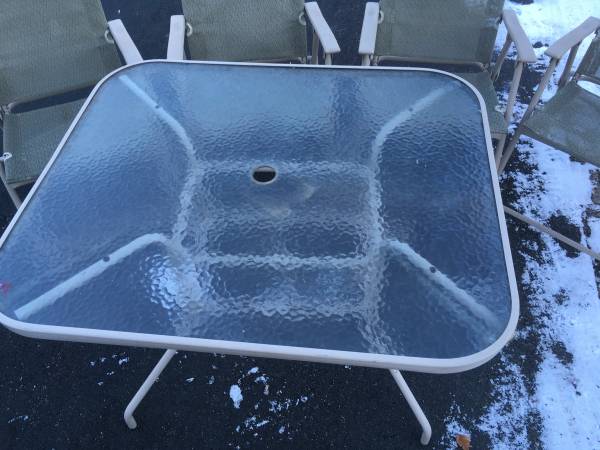 See photos. Made by Rio Creations. One chair is slightly bent (seat part). The glass top table measures 33"x40" top, 28" tall. The top sits fine, but is not attached to the base. 4 folding chairs (1 is slightly bent). The umbrella top is included, the lower pole is not, the .5 part. I now have a lower pole (dark brown) that could work for the umbrella $10