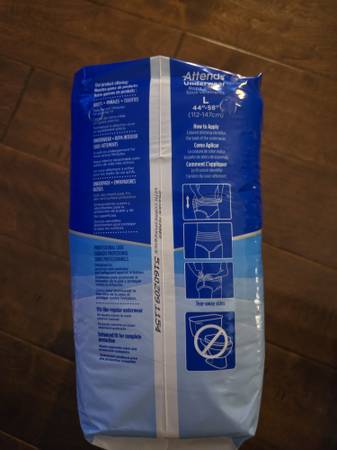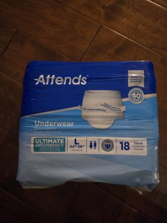 New in Sealed Package 18ct. Attends Ultimate Absorption Unisex Underwear Size Large. 4 Packages Per Box. 9five2 3nine3 68zero7