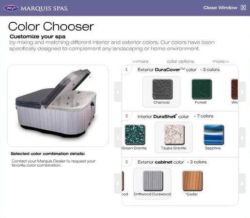 This is a Marquis EHT 530 in excellent condition and barely used. Last year I had 2 small leaks fixed in the front and installed a brand new heat pump and also purchased a new cover for it. This is a 5-6 person hot tub, 84" x 84" x 34". It features 30 powerful jets, runs 22 pumps at 290 GPM, and holds 350 gallons. It runs on a 220/240V circuit and it weighs 780 lbs empty and 3699 lbs. full. It features the Marquis Hydrokinetic hydrotherapy system and HK8 neck jets. It feathers serious lower body and foot therapy, stimulating thigh jets in the lounge, 2 "his & hers" lounges, a deep therapy seatand a super deep soak seat. Average cost to run this is about $14.32 per month for electricity. I always drained it for the entire spring/summer/fall and only ran it in the winter, so my experience has been a cost of about $20 per month since it was colder. I had to completely re-design my back yard, remove the patio, and replace the deck so I need to move this along. I will gladly share my main contact for moving the tub anywhere, installing, and any repairs you may ever need. He is fabulous! This hot tub has been on of the most wonderful things I have ever owned so it hurts to give it up but I have no choice. I will also pass along quite a few supplies, four filters, etc. I will also share where I got to have the water tested at no charge to always tell you if you need to make any adjustments with the chemicals. It is so inexpensive to keep super clean and operational!! This hot tub purchased new today would run about $15,000, as it is top of the line for hot tubs. BTW, the color is the light gray tub base with a charcoal gray insulated cover. This is ready for pick up in Elk River and if you provide me with your email address I can also email you a lot more detailed information about this Marquis spa tub.