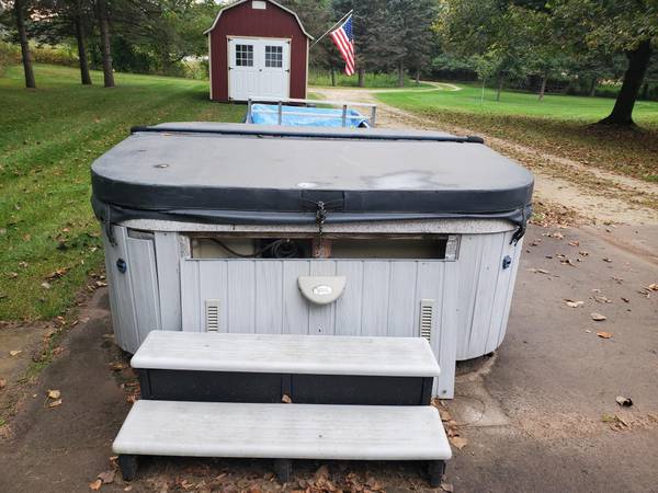 UPDATE: I discovere a small leak on one of the corners. This apparently happened when we moved the hot tub to the front of my house. So I am dropping the price from $2000 down to $900. I have about $1000 into the new heat pump and the new cover and just want to get that. So you could buy this for just the parts, or you could go spend $500 or maybe a little more to have that leak fixed. But the $900 will cover the entire hot tub, steps, filters, etc. but you need to take it home with you. I was able to upload the photos of the heat pump, but can also email them to you upon request.