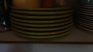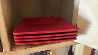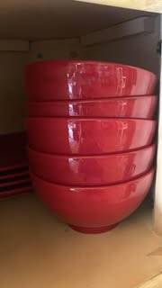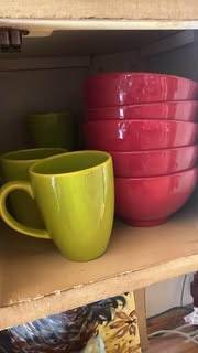 6 green dinner plates & 6 green mugs & 2 green bowls 4 Red Square Lunch Plates & 5 red bowls. 4 orange bowls excellent condition