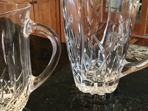 Beautiful cut glass CRYSTAL DIFFERENT SIZE PITCHERS. TWO FOR TEN DOLLARS FOR THE UPCOMING CELEBRATIONS. CASH ONLY PLEASE CALL & LEAVE MESSAGE IF INTERESTED. SANDY ( no chips—no cracks)perfect.