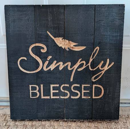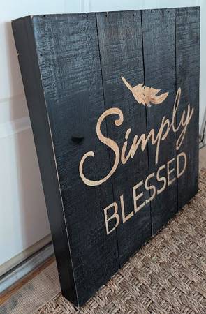 Beautiful wood slat sign that says Simply Blessed. Its 1.5" depth gives you a 3 dimensional look. Dimensions: 15 5/8"H x 15 5/8"W x 1 1/2"D Please email or call Aaron if interested...