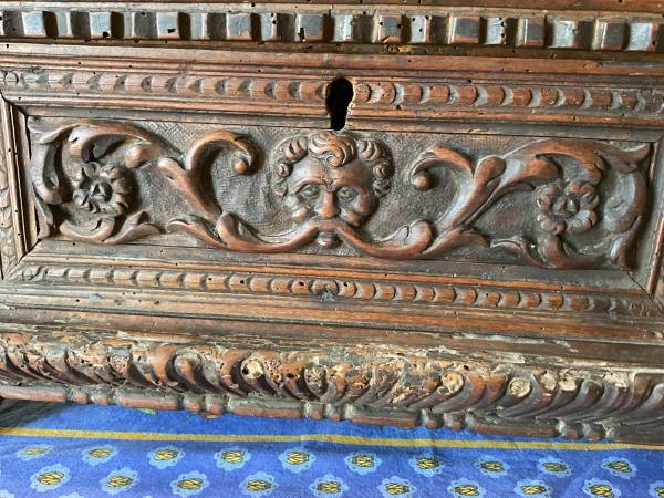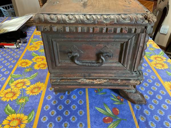 Offering for sale a 14th Italian wooden Cassone.Unique item from the 14th century.Purchased the Cassone or weeding trunk about 40-45 years ago.Unique item hand carved - hand made.Talked to a antique dealer & he said in the condition it’s in it should be worth $900.00 - $1000.00 I like the item and how early it is. worm wood was a common problem.Looks exactly the same as the day I purchased the Cassone or Wedding Trunk .Owned this trunk for 40 years.