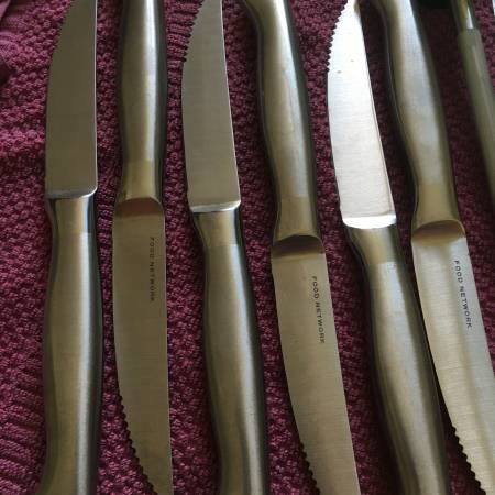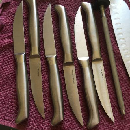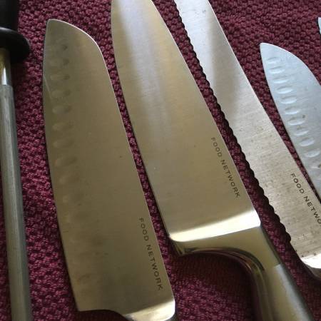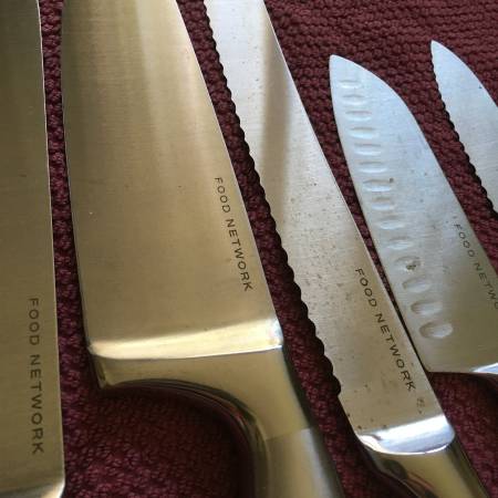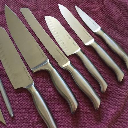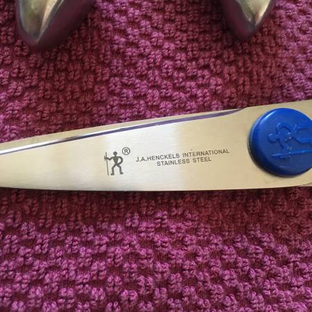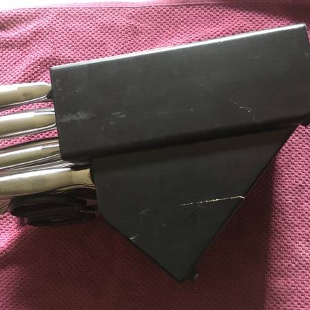 See photos. JA Henkels scissors. The knives have a couple spots (could clean up, maybe) the block shows a bit of use.