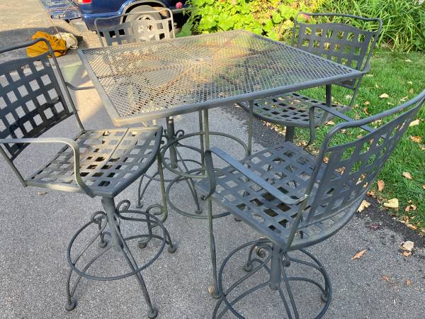 All of the metal is solid, except for the upright part that holds the seats. Not perfect, but way less than half price. Use as is, or fix up this winter. It is faded, dark brown with gold flecks. 1 chair has a slight issue, but works just fine. Peeling paint on 3 of the 4 chair seats, I have some chair cushions available for sale, if you are interested. It is missing a few plastic foot caps. I would take them off one item (the table for example) and make sure the chairs are all the same height. The table is 36" square and 40" tall.