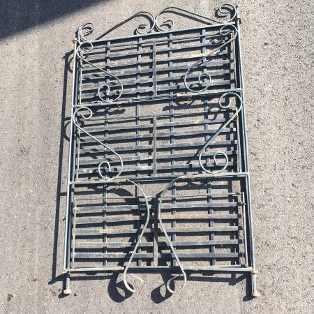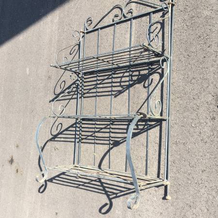 Use on some sort or table, or maybe hang from a wall, or just use as is. Light wrought iron plant (OR?) stand/shelf. 40" tall, 22" wide and 12" at the deepest spot. Paint if you wish. See photos