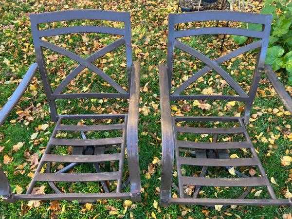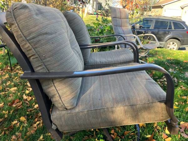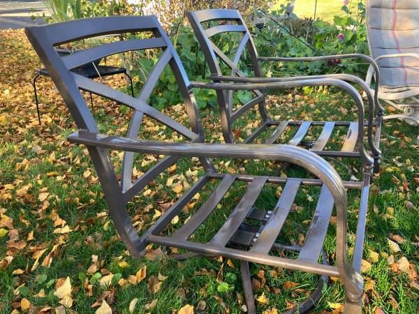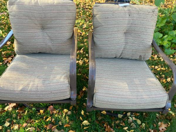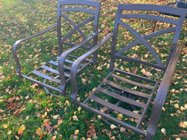 2 Nice patio chairs that both rock and swivel. The cushions are decent, use as is or find your own cushions.