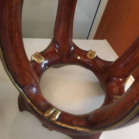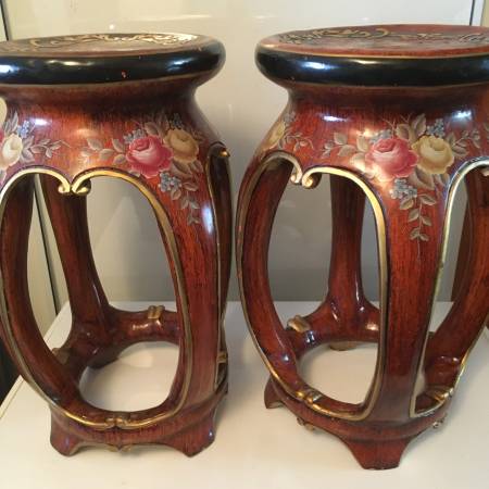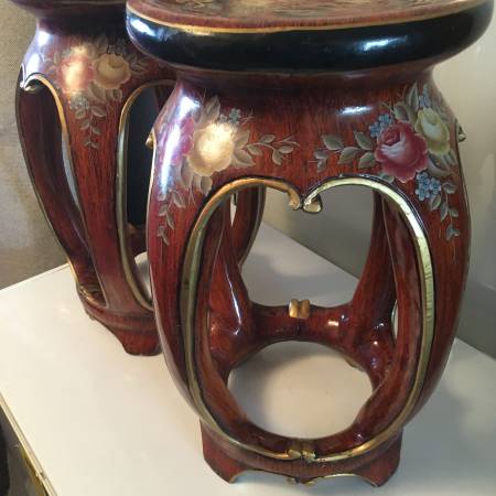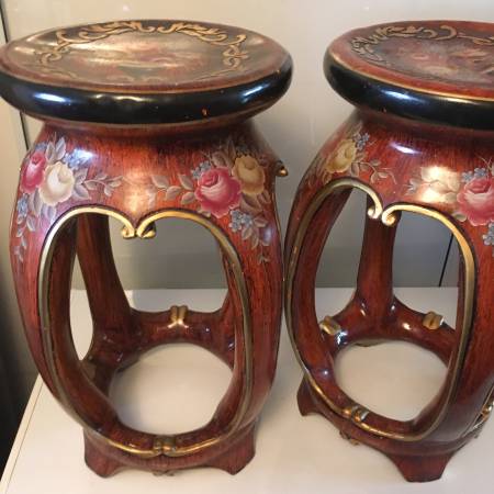See photos. They are 19" tall and the concave seat (?) is 11" across. Use as a seat, a plant stand or whatever you wish. They are heavy duty and I think made of resin, but could be wood. They could also be vintage. Made in China sticker on the bottom.