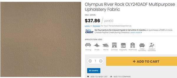 Olympus River Rock OLY240ADF is A Durable, Multipurpose Fabric Good for Automotive, Marine, Contract/commercial, and Other Heavy-Use Applications. Because it is Stain-Resistant and Antimicrobial, it is Easy for Us to Recommend ITS Use in Playrooms, Recreational Areas, Fitness and Exercise Centers, Healthcare Facilities, and Entertainment Venues.