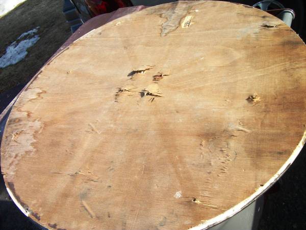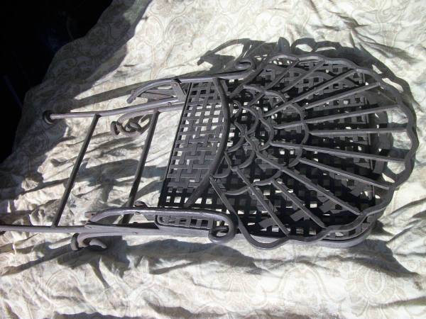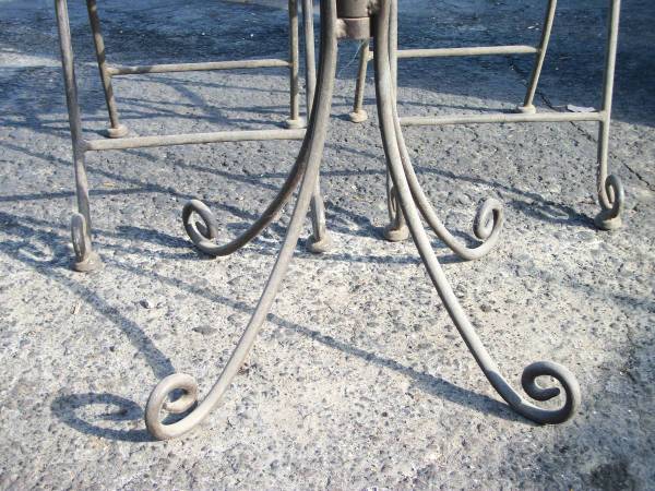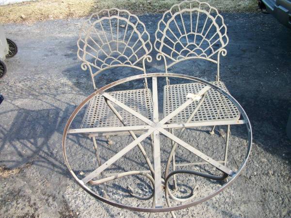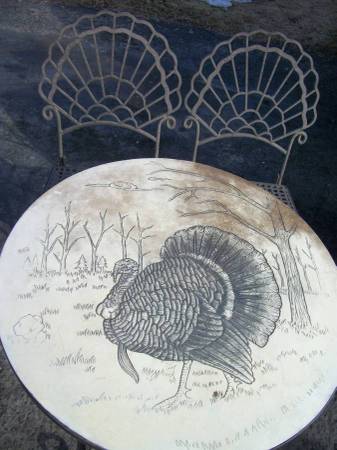 Heavy, vintage wrought iron bistro set with folding chairs. These will not blow around in the wind. The chairs are 35.5" tall at the back, the seat is 19" tall. The seat is 13" deep and 14.5" wide in the front. Painted brown, maybe. The table has a turkey image sort of carved into what I think is a plastic top with plywood on the bottom. The chairs have sort of a turkey tail feather fan look to them. The top is not secured to the table base so if you wanted to change it, you could. Use glass or some other top if you prefer. I think the table top could be cleaned up if you wanted to keep it.
