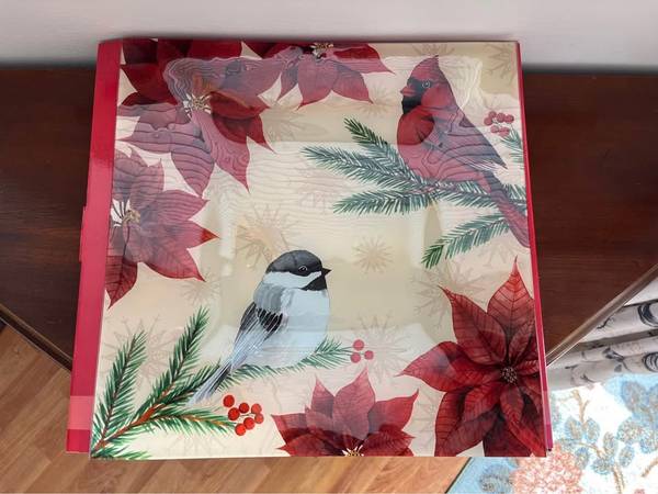 Pfaltzgraff “Wintertime Birds” Serving Platter, $20. Measurements are 15” x 15”. Hand Wash only. Non-smoking home. FCFS, must pick up in Zimmerman (we’re on the northern end, closer to Princeton).