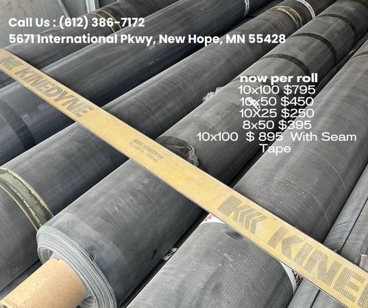 RUBBER 10X50 60 MIL FIRST QUALITY SELL $450.00 ROLL 10X100 60 MIL FIRST QUALITY FIRESTONE FORCE WITH SEAM TAPE INCLUDED WAS 1700.00 SELL 895.00 10X 100 60 MIL FIRST QUALITY CARLISLE REINFORCED WAS...