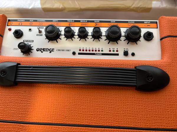 35 watt amp with great options. This amp has great analog sounds, with solid state dependability. Two channels, clean and dirty, with reverb and built in tuner, and effects loop. Comes with Orange...